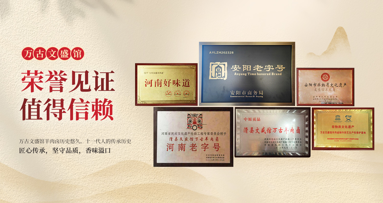萬古文盛館羊肉鹵從始至今,始終堅持“每代傳一門,傳男不傳女,傳內不傳外”的祖規。在傳承過程中,很多有關典籍已失于戰亂和水患。主要收集的傳承譜系和有關記載如下: 第 一代:王家孝(1654-1733)萬古文盛館羊肉鹵創始人; 第 二代:王憲文(1678-1758); 第 三代:王全仁(1710-1788); 第 四代:王元相(1748-1830); 第 五代:王克敬(1778-1869); 第 六代:王心欽(1807-1887); 第 七代:王光玉(1839-1921); 第 八代:王發喜(1869-1919); 第 九代:王文聚(1905-1981);王文聚在當地人緣極好。他在梁村集長期經營飯館,經濟條件比一般人較好,常常資助貧弱者。中華人民共和國成立之初,為了響應國家的號召,并把正在經營的文盛館全部資產,融入萬古合作社,將原梁村文盛館店址搬遷到萬古集經營。成為了供銷社的正式職工,擔任羊肉鹵制作技師,一直工作到退休,他制作羊肉鹵的技術非常高超,味道鮮美獨特,把畢生精力全部用在羊肉鹵的研發、創新、傳承上,因萬古玉皇閣(全國四大名閣之一)廟會影響周邊數百公里,每天食客絡繹不絕,皆以吃上王文聚親手制作的羊肉面為榮,影響巨大。 第十代:王守真(1944-2009);改革開放初期,受聘于滑縣飲食服務公司,先后在順河街回民食堂、國營旅社回民飯店工作,專門從事羊肉鹵的制作經營和技術傳授。王守真善于鉆研,并不斷創新,使萬古文盛館羊肉鹵的品質得到又一次飛躍。 王洪標、第十一代傳人,王洪標2010年被河南省人民政府授予省級萬古文盛館羊肉鹵制作技藝傳承人。王洪標在繼承前十幾代藝人傳統技藝的基礎上,大膽探索、潛心鉆研、不斷創新,是羊肉鹵的味道更加鮮美,醇香四溢,正如坊間盛傳“食一口而動全身,讓人回味無窮之妙”,以及“東西南北都吃遍,不如文盛館羊肉面,喝一碗文盛館羊肉湯,一年四季想得慌”,可見其味道堪稱珍饈美饌。王洪標開展手工技藝和傳統文化的廣泛傳播,大力培養技術人才。建設規模性養殖園,對每只羊從喂養到餐桌整個鏈條,實行身份證識別制度,建立綠色環保經營模式,面向全國開展連鎖加盟經營,讓更多人吃上放心肉和傳統的美味佳肴而努力。 2007年;河南省文聯、河南省委宣傳部授予“河南老字號”稱號; 2009年6月,被河南省人民政府、河南省文化廳列入“河南省非物質文化遺產”保護名錄; 2010年,被安陽市人民政府列入“安陽市非物質文化遺產”保護名錄; 2016年6月,被河南大河報、河南餐飲與飯店行業協會評為“河南好味道”; 2016年9月被河南省民間文化遺產搶救工程工作委員會、河南省民間文化遺產搶救工程專家委員會、河南省民間文藝家協會授予“中原貢品”稱號; 2017年被錄入聯合國教科文組織非物質文化遺產大數據平臺,文盛館羊肉鹵制作技藝生產性保護基地 2020年授予:中華老字號 2021年4月授予:安陽美味 2023年授予商務局:“安陽老字號”中 央電視臺CCTV7“鄉土”、中 央電視臺CCTV7“鄉愁”河南省電視臺“老家的味道”、CCTV17套“”誰知盤中餐”CCTV央視2套、河南省電視臺“香香美食”、河南省電視臺“老家的味道”滑縣電視臺、“傳奇滑州”等各大媒體采訪宣傳報道。 “文盛館”羊肉鹵,展示了中原飲食,文化的博大精深,展示了民間傳統手工技藝的獨特。為積極宣傳中原傳統飲食文化起到了無可代替的推動作用。
